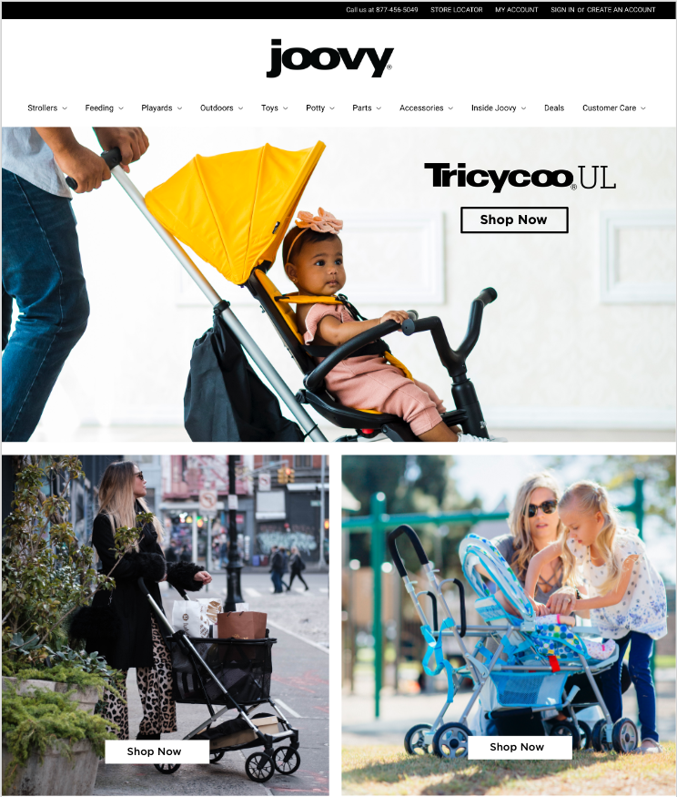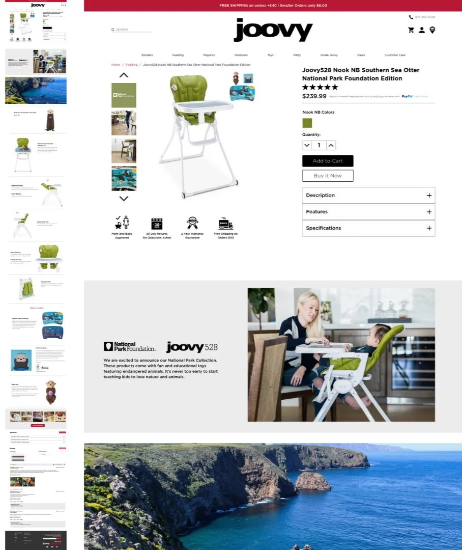 Here are examples of my work in web design for Joovy. I was responsible for creating wireframes, page mockups for developers, designing promotional sales materials, product pages, digital graphics for both mobile and desktop, and curating product photography.